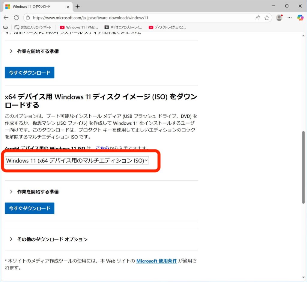ページの少し下の方にある、「x64デバイス用Windows11ディスクイメージ(ISO)をダウンロードする」の項目内にある選択肢で、「Windows11(x64デバイス用のマルチエディションISO)」を選んでください。