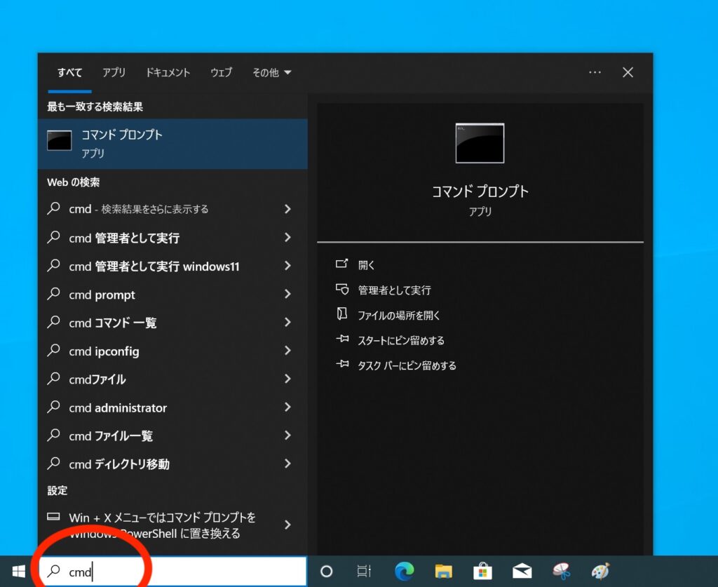 タスクバーにある検索ボックスに「cmd」と入力してEnterキーを押します。