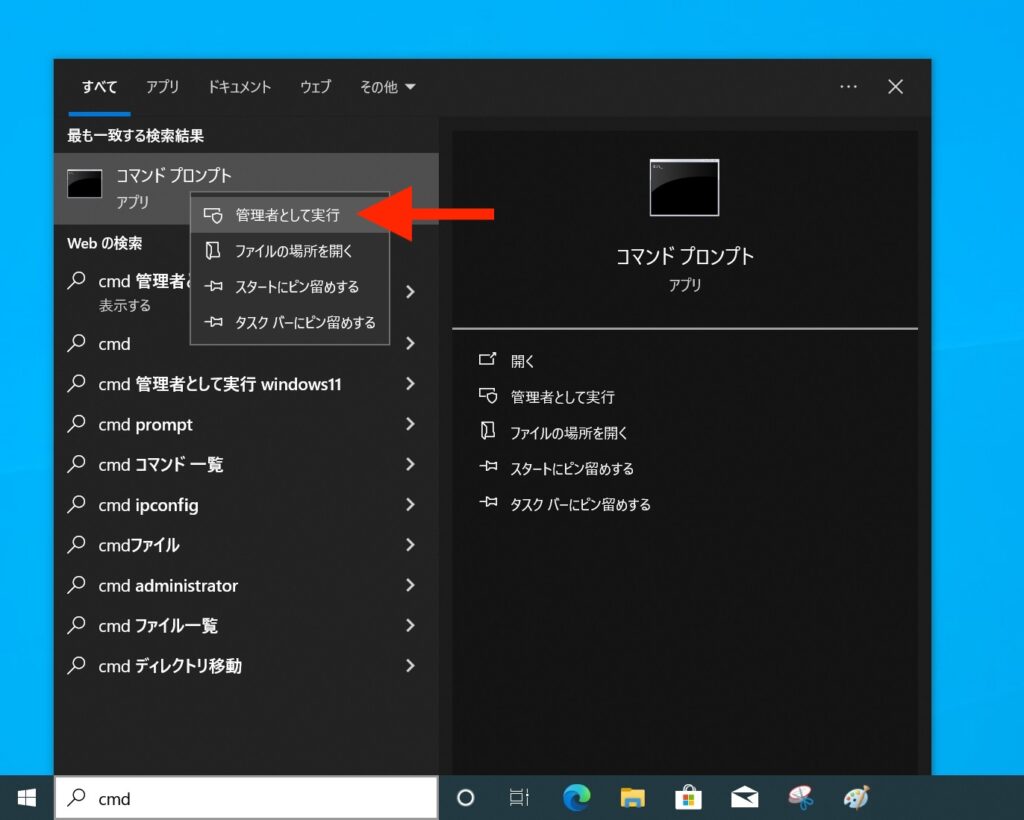 「コマンドプロンプト」のメニューが出るので、右クリックして「管理者として実行」を押します。