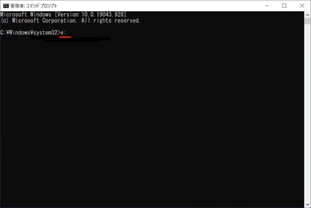 C:¥Windows¥system32> の後ろに、Dドライブの場合は「d:」、Eドライブの場合は「e:」と入力してEnterを押します。今回の例ではEドライブなので「e:」と入力しています。