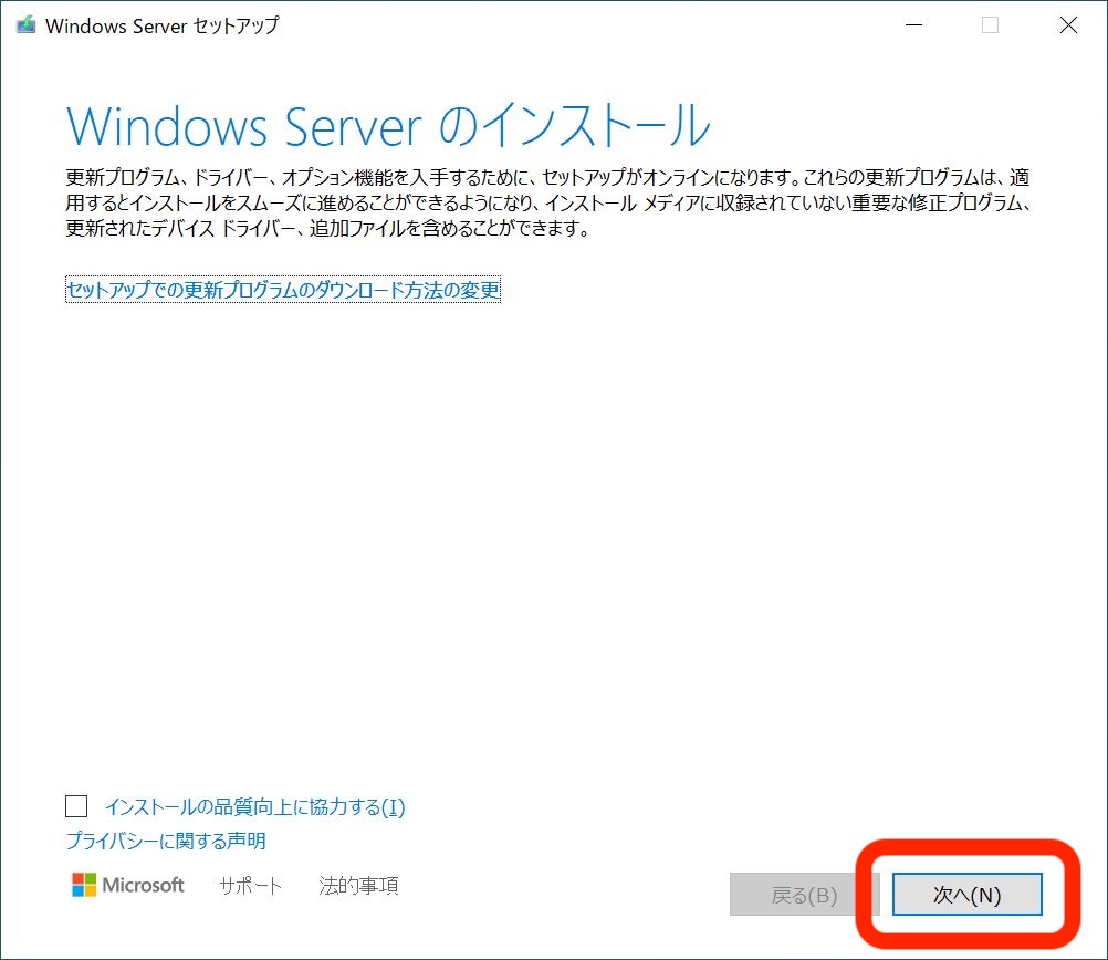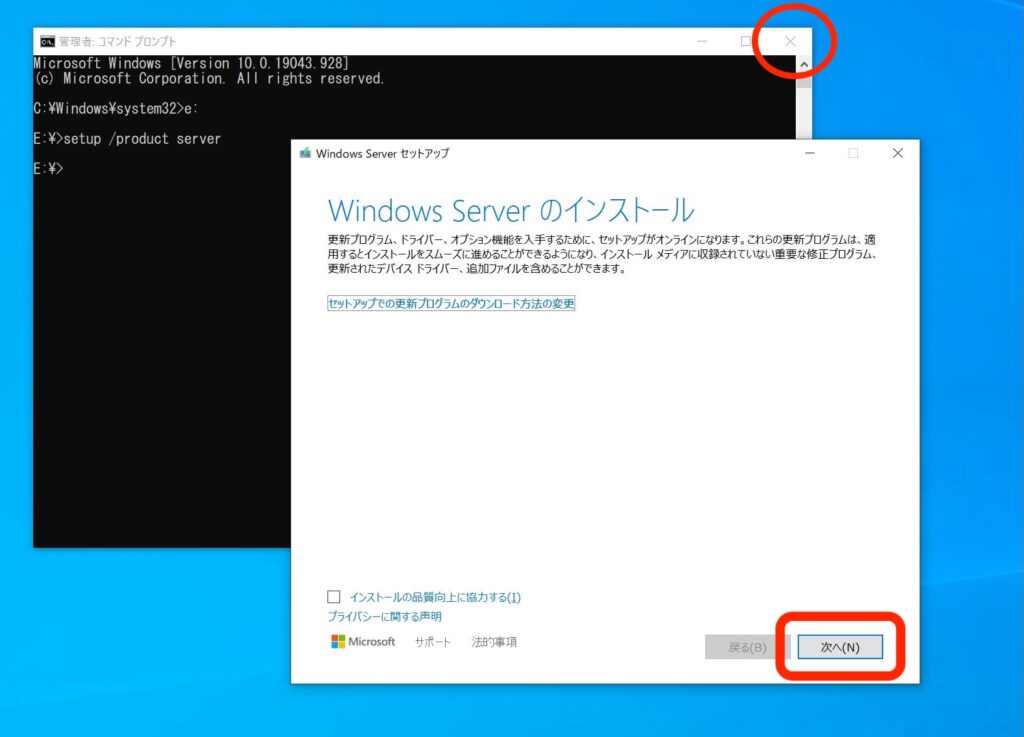インストーラーが起動しました。「Windows Serverのインストール」と表示されていますが、Windows11がインストールされます。コマンドプロンプトはもう使わないので、バッテンを押して閉じておきましょう。その後、「次へ」をクリックします。