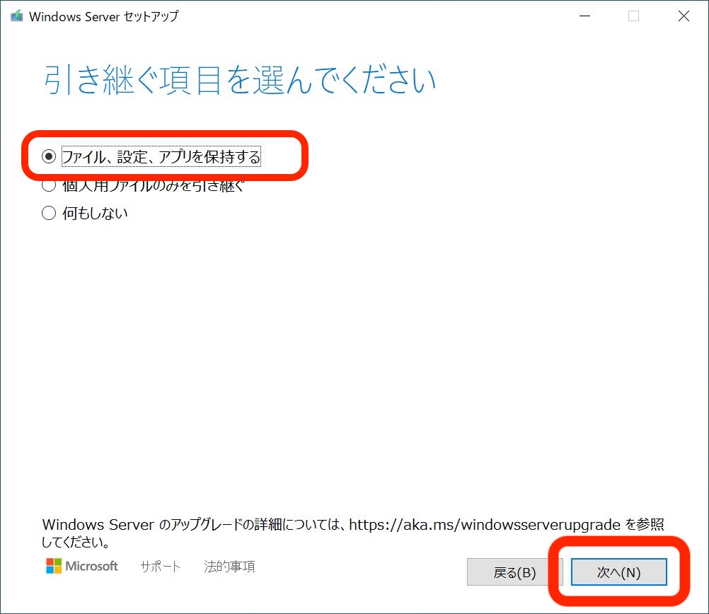 ここは重要なポイントです。今回は今のPC環境のまま、Windows10からWindows11にするので、「ファイル、設定、アプリを保持する」を選んでください。