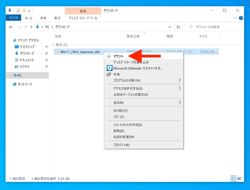 ダウンロードしたファイル(Win11_24H2_Japanese_x64という感じの名前です)を選択状態にしてから、右クリックして、「マウント」を選択します。