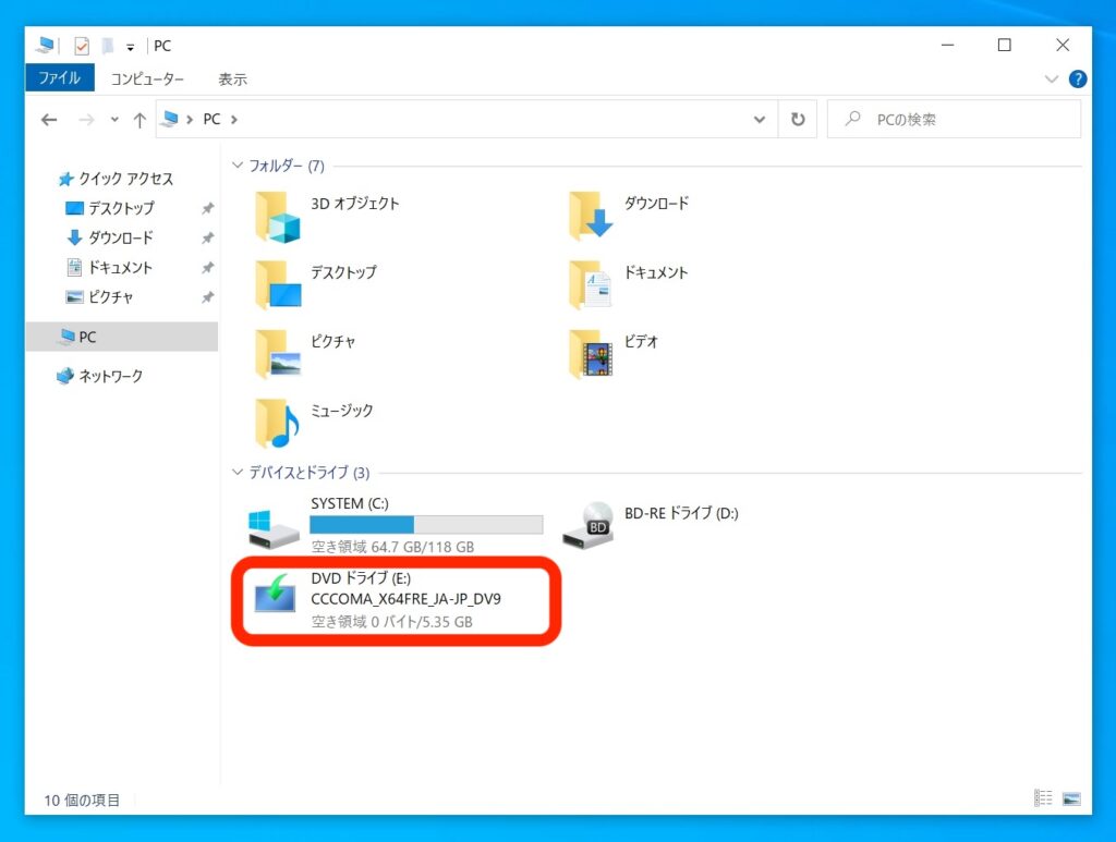 ISOファイルをマウントすると、仮想DVDドライブとしてPC内に出てきます。