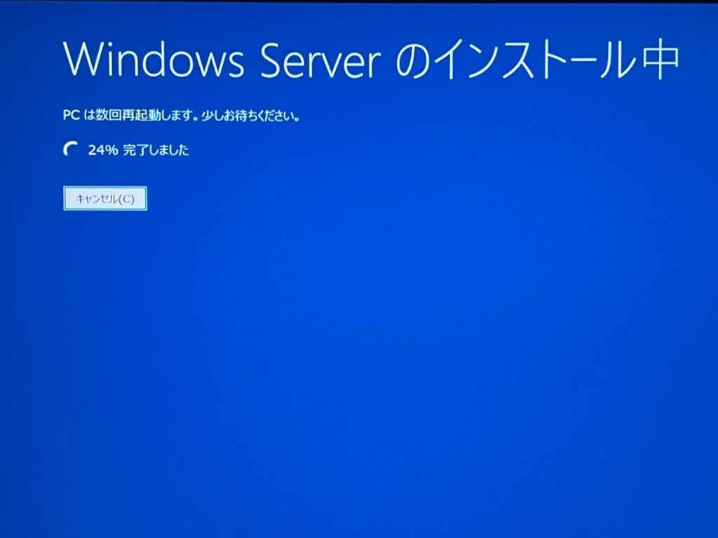 このような青い画面で「Windows Serverのインストール中」と表示されます。